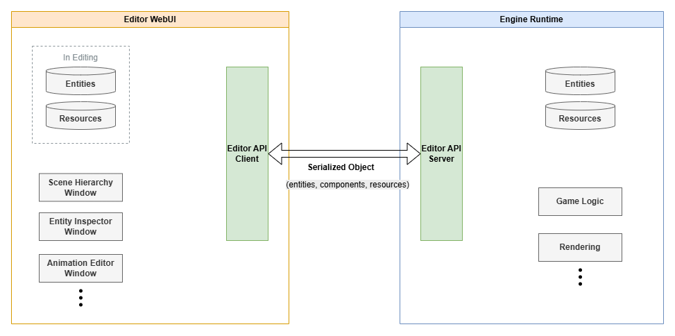 Engine Runtimeは、実際のゲームデータ(エンティティ、リソース)を保持し、Editor API Serverを通じてエディタからの要求に応答する。